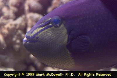 It is almost impossible to dislodge a triggerfish once its trigger is in an erect position. The Niger Triggerfish is found mainly in the Indo Pacific and Red Sea.. There seems to be little difference in coloration from the two different regions. The coloration of the Niger Triggerfish seem to vary from blue to purple with many having a combination of the two. The most interesting feature in this triggerfish is the fact that the front teeth or fangs as many people call them, tend to have a reddish hue to them, hence the common name of Red-tooth triggerfish. Triggerfish can deliver a very painful bite easily drawing blood, so use caution if you must put your hand in the tank. Another feature of the Niger Triggerfish is that it has a lyre tail that can extend a few inches beyond the body reminding one of the Naso or Unicorn tang. They are extremely disease resistant and they have been known to survive the cycling period of a newly established aquarium (we would not recommend it). Triggerfish are also equipped with their own moving company, rearranging the tank decorations to suite their taste.